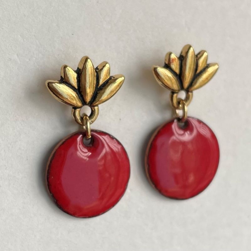 These earrings are small but powerful in their presence. Dainty and elegant enameled circles hang from golden lotus flower posts. The lotus posts are gold-plated pewter and come with wide rubber earring backs to ensure they hang evenly on your ears.